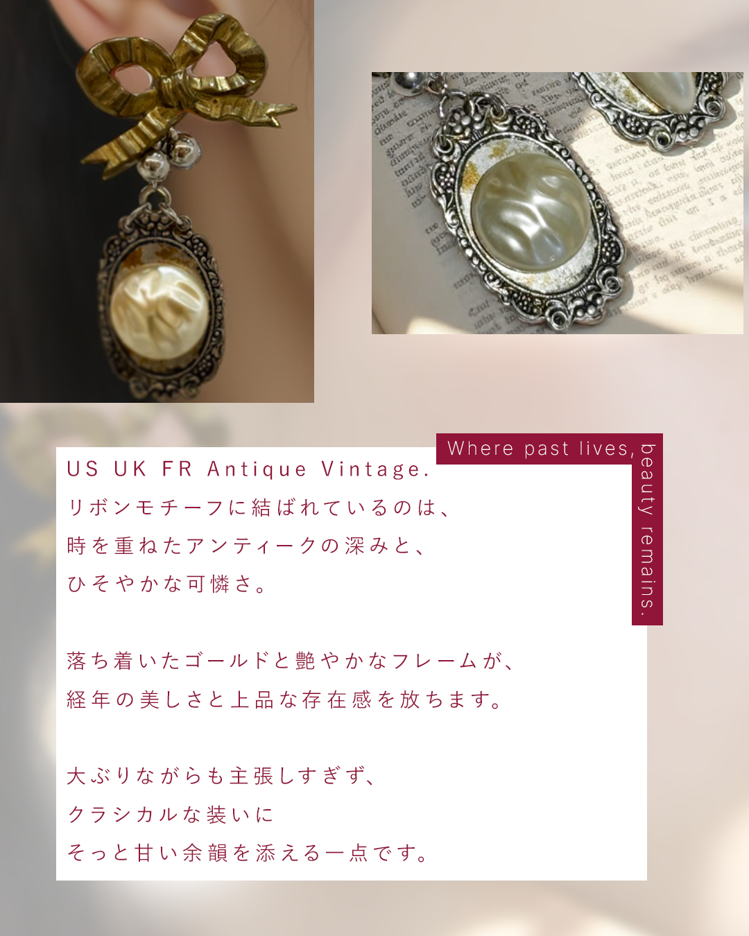 US UK FR Antique Vintage. リボンモチーフに結ばれているのは、 時を重ねたアンティークの深みと、 ひそやかな可憐さ。 落ち着いたゴールドと艶やかなフレームが、 経年の美しさと上品な存在感を放ちます。 大ぶりながらも主張しすぎず、 クラシカルな装いに そっと甘い余韻を添える一点です。
